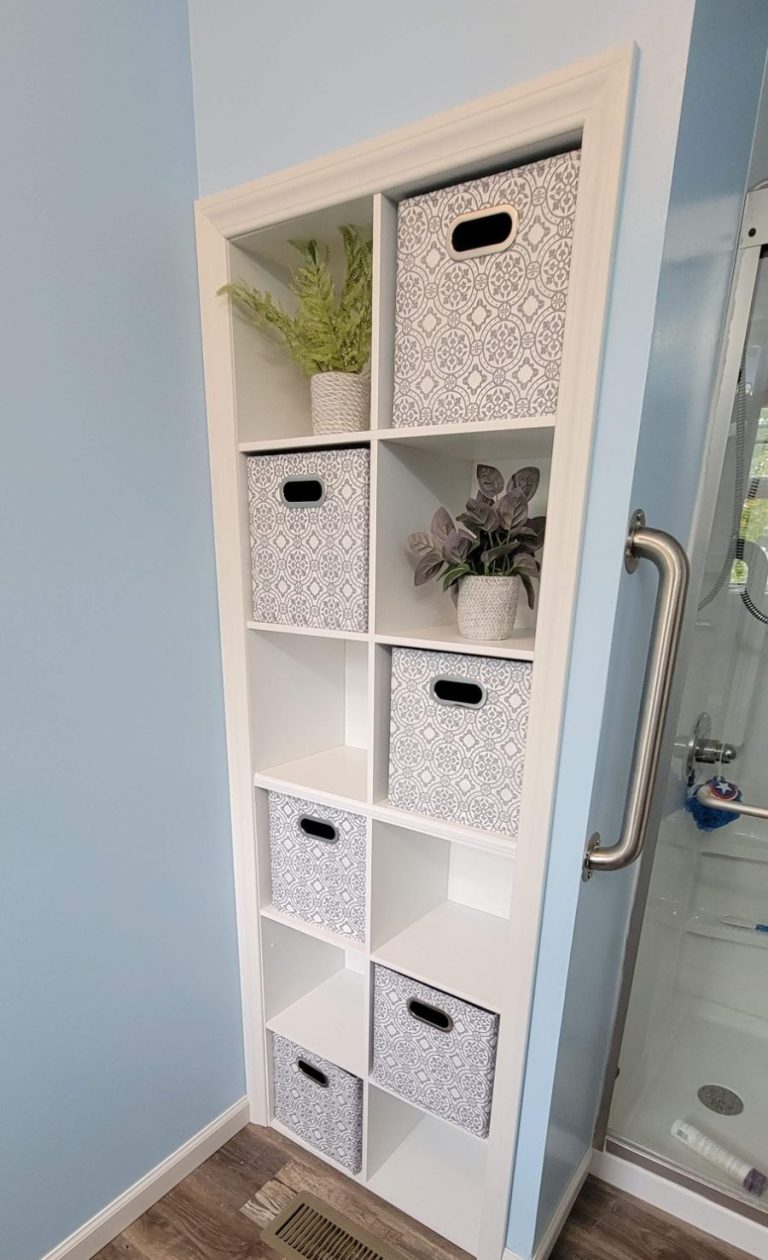 A customer needed to get rid of an eye sore closet doors. Customer asked for shelving to hid the utility closet.